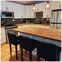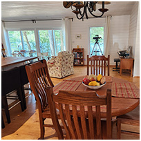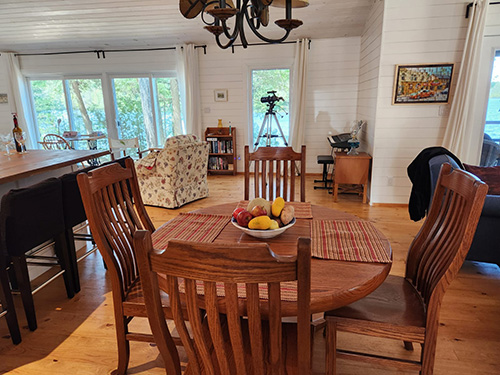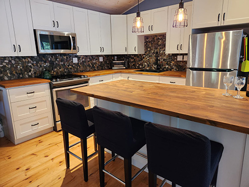 The main cottage features a fully equipped gourmet kitchen, and includes a stainless steel electric range, a full size refrigerator and coffee makers.
