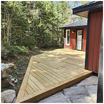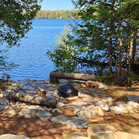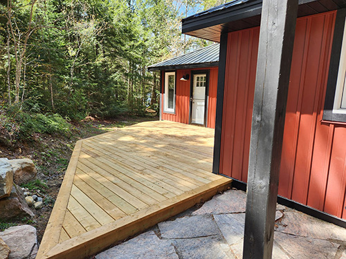 The forest surrounding the cottage is thinned out but nicely shaded to the waters edge, with full sun on the dock from mid morning but shade under the pines if needed.
