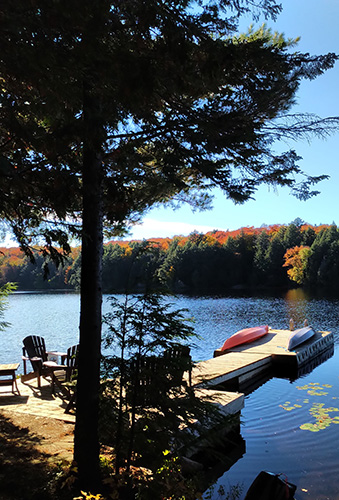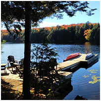 The forest surrounding the cottage is thinned out but nicely shaded to the waters edge, with full sun on the dock.